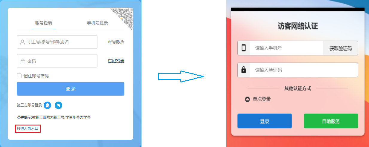 因工作关系需在校用网的外来人员,可在认证页面点击“其他人员入口”,输入手机号,通过短信验证访问校园网。