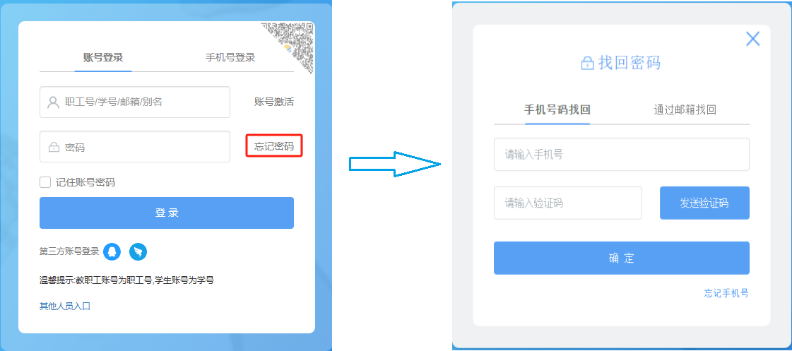 师生可以通过手机号码或绑定的邮箱找回密码,也可以通过企业信息与信息技术中心李湘老师联系进行重置,重置后密码为身份证后六位。