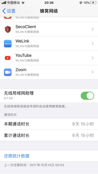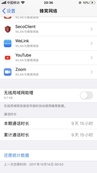 3、 进入蜂窝网络,滚动至最底部,查看无线局域网助理,关闭无线局域网助理