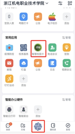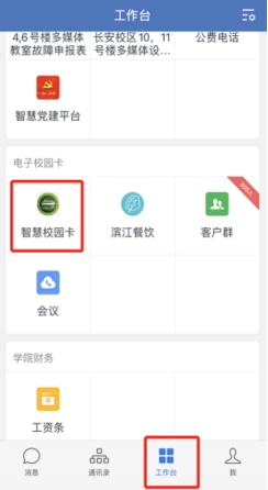 钉钉--工作台--智慧校园卡。