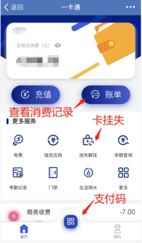 2、查看消费记录、打开支付码位置、挂失等