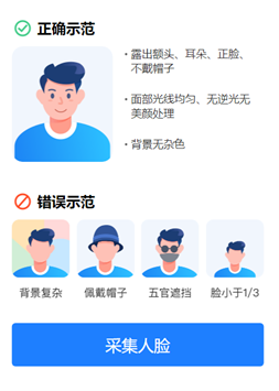 4. 之后即可通过拍照或上传本人照片的方式进行采集,若采集失败,页面会提示具体错误原因。