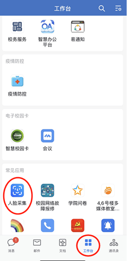 1.打开企业微信工作台页面,在常见应用找到“人脸采集”并点击,详见下图: