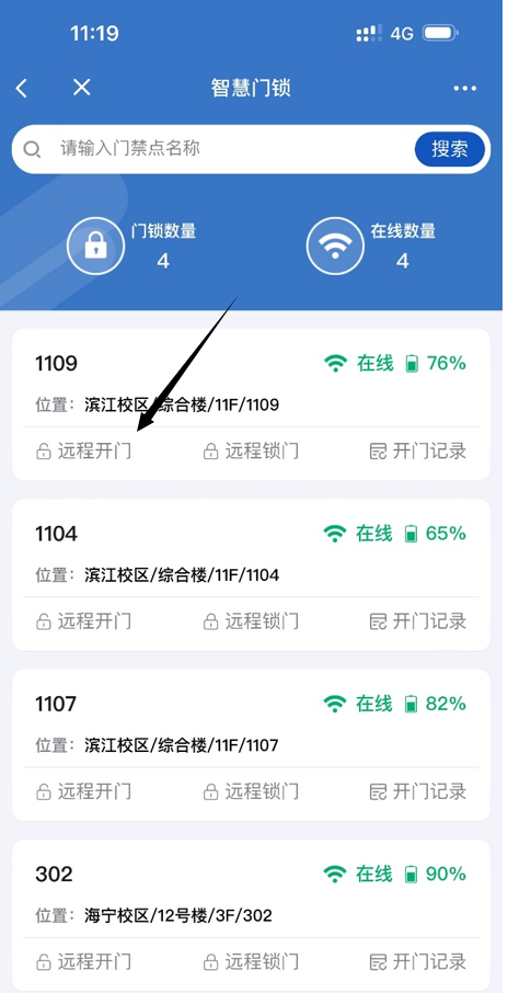 远程开门适合临时远程开门的场景,比如第三方人员临时进入,请慎用!可通过企微智慧门锁应用,找到要开门的锁,然后点远程开门即可。如果遇到远程开门有问题,紧急情况可使用密码开门(见开门方式1),密码也可以修改后再使用,使用之后再改回来。