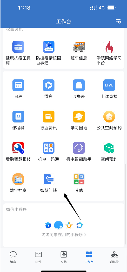 企业微信 -> 工作台 -> 智慧门锁,如下图所示: