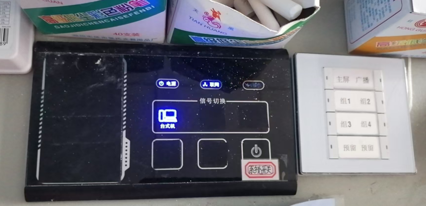 这是一间数学建模实训室,投屏需要借助桌面上的信号切换器,如下图: