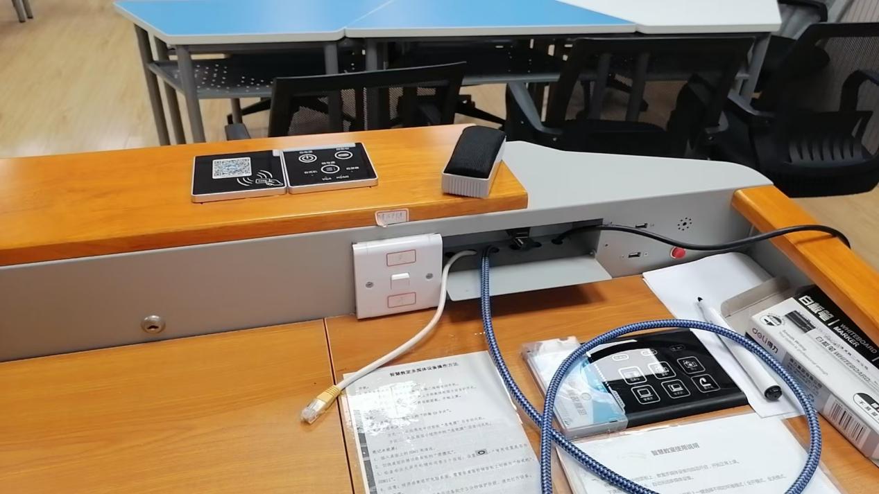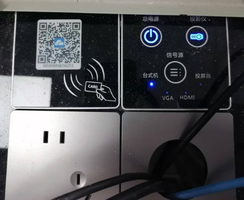 中控的电源:包含教室内墙壁上的空开不能分闸,包含讲台后右侧的讲台柜的电源插座不能拔掉,如果中控面板上有蓝色的信号灯在闪,说明电源是连接的。请特别注意,若中控设备断电后,重新上电需要等待5分钟左右,因为交换机的光转电模块启动稍微慢些。
