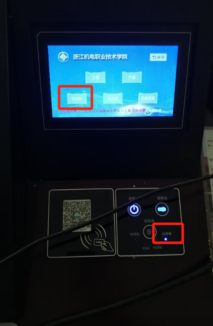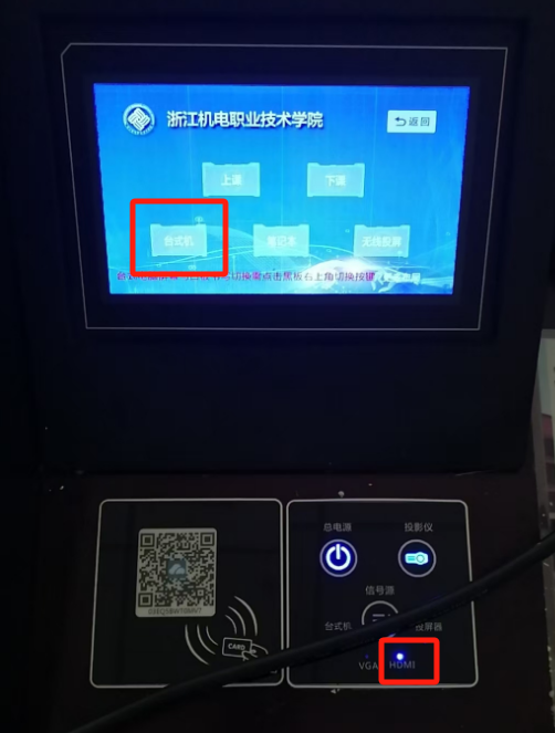 笔记本屏HMDI投屏在黑色液晶功能显示上的“台式机”信号下直接插入HDMI高清线,这时中控设备面板的信号自动切换显示为“HDMI”。