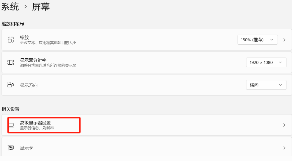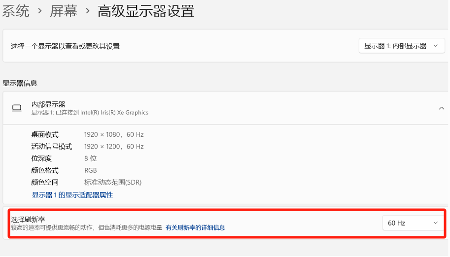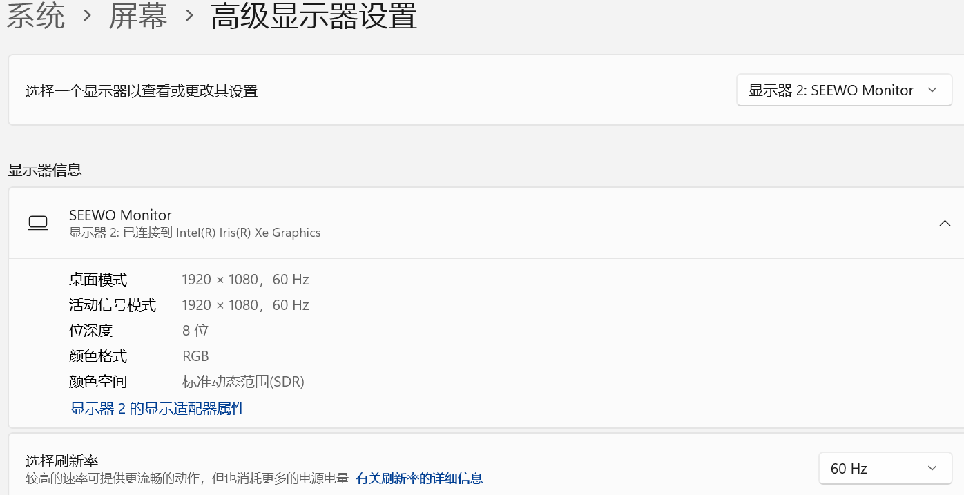 在高级显示器设置中“选择刷新率”为60HZ,同样,在显示器2中也设置刷新率为60HZ: