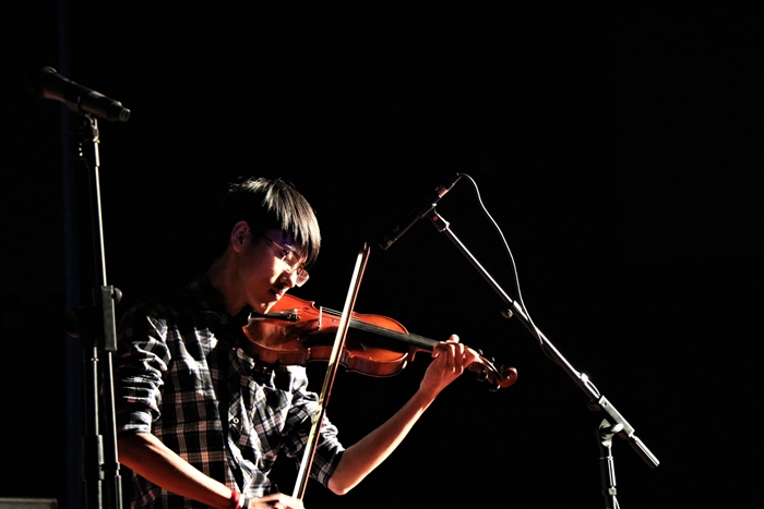 晚会现场人头攒动,荧光闪耀,掌声、呐喊声,声声入耳。天慕乐队首先弹唱了《男孩别哭》、《说散就散》、《suger》,让大家感受到了吉他演奏音乐的美妙;天慕成员陈晗给大家带来了精彩的吉他指弹《felicity》和《等待的风》;浙江财经学院东方学院吉他社社长周胜演绎了《landscape 》;天慕声乐老师徐浩钢琴弹唱了《大江东去》,浑厚的嗓音和舒展潇洒的旋律把大家带进了温和儒雅中伴着雄浑悲凉的意境;机械类1734班范博文小提琴独奏《spring》,优雅的旋律让大家回味无穷;天慕吉他社社长林子来和范博文合奏的《权力的游戏》,擦出了流行和古典碰撞的火花。本场晚会还邀请了台州吉他协会常务理事、独立音乐人江云忠,他给同学们带来了一首《Megamouth》,调弦、拍击,展示出了他专业的指弹手法,把晚会带向了高潮。最后晚会在全体成员精彩的民谣《鼓楼》弹唱中结束。