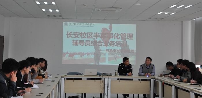 为进一步提高辅导员处理各项应急突发事件的能力,提升专业化水平,由学工部组织的“半军事化管理辅导员综合业务培训——应急突发事件的处理”专题讲座于近日在长安校区8号楼会议室举行,长安校区学生处成员、辅导员共20余人参加本次讲座,讲座由学工部副部长温长胜主持。