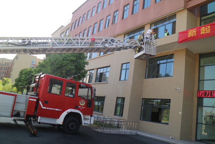 图为消防官兵利用登高平台消防车救援被困学生