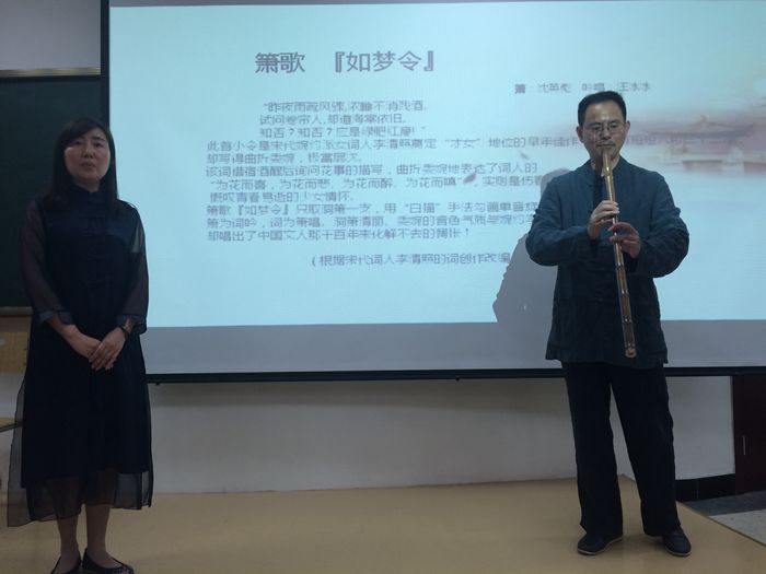 5月14日晚,钱塘箫社创始人沈英彪先生走进长安校区,钱塘箫社于2007年10月7日在杭州曲院风荷成立。沈英彪先生号“武林箫史”,沈老师演奏的洞箫音色纯美、韵味隽永、含蓄优美、儒雅细腻,给大一学生带来了一场视听盛宴。