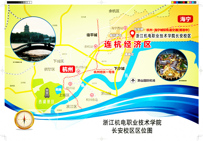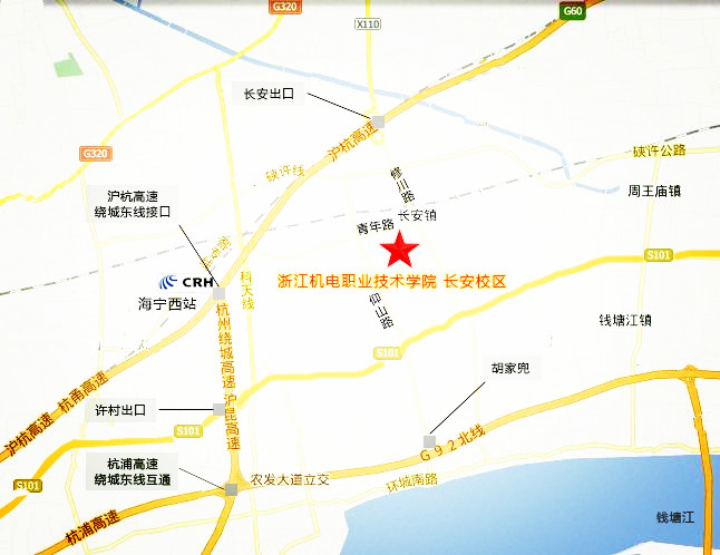 3、走杭州绕城高速东线(上海方向)从“许村”出口,右转至S101省道(东西大道)向东直行约4公里,左转至崇长公路向北直行约2.4公里,到达校区西门。(沿路设有引导牌)