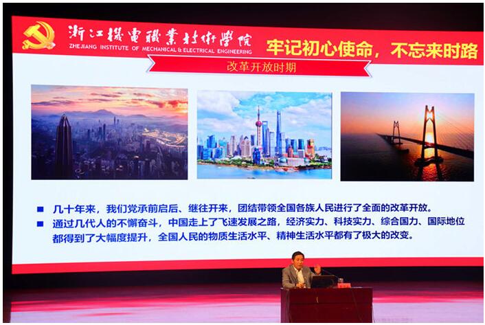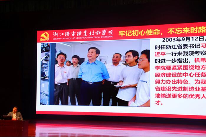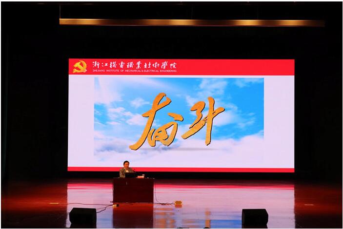 开班典礼结束后,黄道平书记为师生作了主题为“坚守初心,励志奋斗,做新时代机电人”的专题报告。黄书记的专题报告分4个内容,分别是主题教育,共产党人的初心,新时代新使命新要求以及青年大学生如何担当。黄书记重点解读了“不忘初心 牢记使命”主题教育的时代背景、要求、具体目标及根本任务;从“为了谁、依靠谁、我是谁”的角度切入,详细阐述了共产党人的初心和使命,并简要讲述了学院的办学历史、办学理念、校训以及办学成果。机电人的初心和使命,让师生对习近平新时代中国特色社会主义思想有了更深刻的理解。黄书记指出,同学们要有勤学修德的学习观;要有扎根基层的实践观;要有勇于担当的为民观;要有爱国爱校的价值观。要不忘初心跟党走,牢固树立理想信念,始终坚定四个自信;要志存高远,脚踏实地,把学习作为首要任务,树立梦想从学习开始,事业靠本领成就的观念;要肩负起时代赋予的重任,敢于吃苦,勤于实践,善于开拓,争当先锋,成就“奋斗的青春”。黄书记勉励同学们要有志向、有专长、有自信、会读书,做自立的人、有情谊的人、有道德的人和有信仰的人。