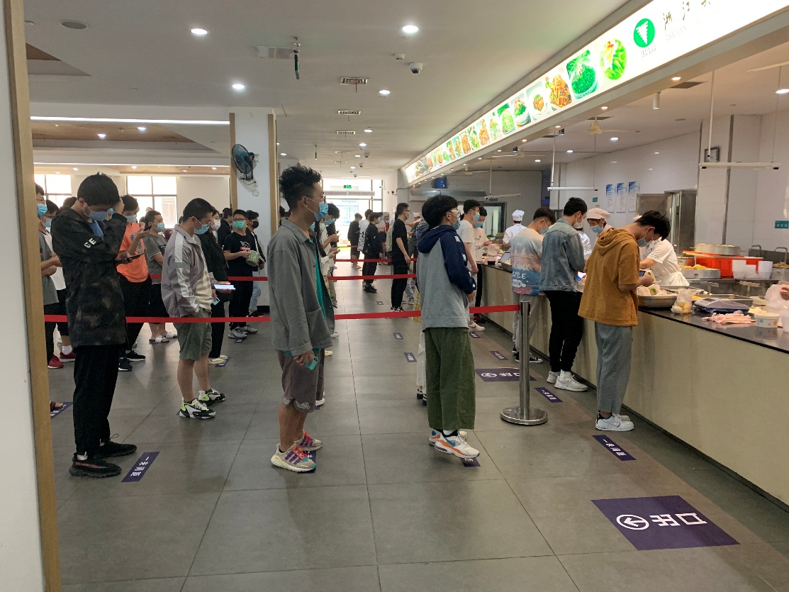 为着力打造放心饮食环境,守护返校师生“舌尖上的安全”,着重对食堂的食品安全及防疫专项培训、从业人员健康管理、环境清洁消毒、食材安全管控、就餐防控管理等重点环节进行了严抓细管、严防细控。同时,为保障师生有序、高效就餐,各楼层对就餐大厅进行了重新布局,明确食堂出入口,并且开展了张贴防控提示标识、提供免洗手液、安排就餐引导志愿者、分批错峰就餐等多项防控措施,按地贴标示保持1米安全距离打餐,用餐实行每人一桌,提倡自带餐具、打包带走,还为学生提供了订餐预约服务并到指定地点领取,确保防控工作有序、有力、有效。
