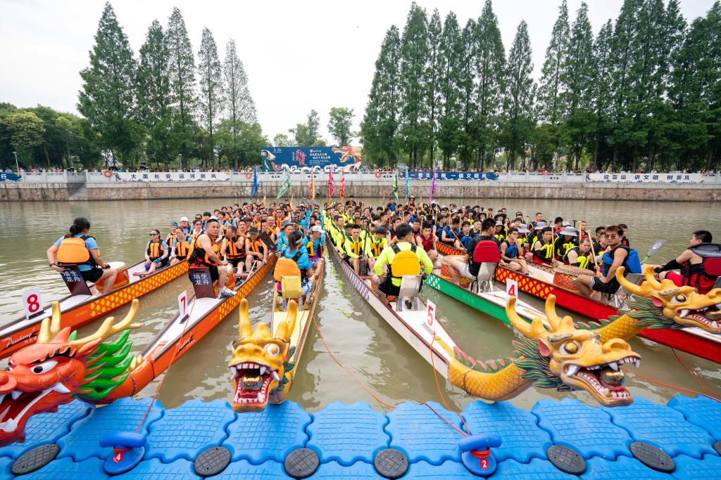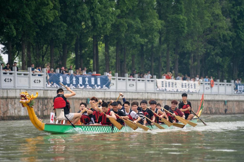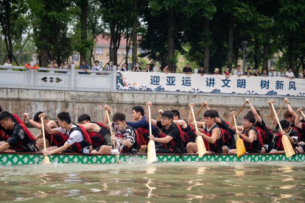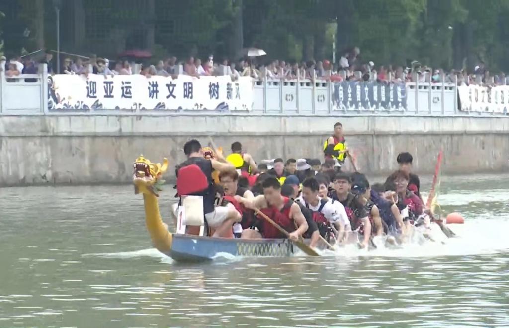 10时,现场鼓声响起,船桨划动,古老的大运河瞬间被激活。600多米的河道上,船桨翻飞、水花四溅,两岸人声鼎沸、加油呐喊声响彻大地。