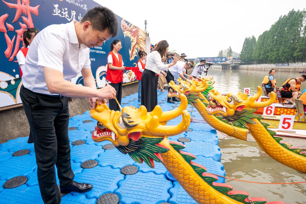 开赛前,现场举行授旗和“龙舟点睛”仪式,寄托对美好幸福生活的向往与期盼,预祝健儿们乘风破浪、勇创佳绩。