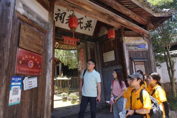 走进大济古村,实践团同时担当“古建记录员”与“温情陪伴者”。队员们举起相机精准捕捉“双门桥”石拱、“吴氏宗祠”飞檐的构造细节,用笔记速写解析砖瓦样式中蕴藏的生态智慧;他们被老党员门楣上的家训吸引,逐字抄录“孝亲敬长”“勤俭持家”等斑驳墨宝并拍摄场景,着手汇编《大济村家训集》。在吴家老宅,队员们耐心聆听房主吴奶奶讲述往事,记录鲜活的口述历史;带着问卷,放慢语速、辅以手势与留守老人深入交流,并针对“怕普通话不好”的痛点开设“推普小课堂”,一字一句帮老人纠正“廊桥”“宗祠”发音。