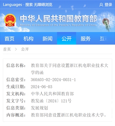 《浙江省人民政府关于商请设立的函》(浙政函〔2023〕117号)收悉。根据《中华人民共和国高等教育法》《中华人民共和国职业教育法》《普通高等学校设置暂行条例》等有关规定以及第八届全国高等学校设置评议委员会评议结果,经教育部党组会议研究决定,同意以浙江机电职业技术学院为基础设立taptap点点官方网站,学校标识码为4133012861;同时撤销浙江机电职业技术学院的建制。现将有关事项函告如下。