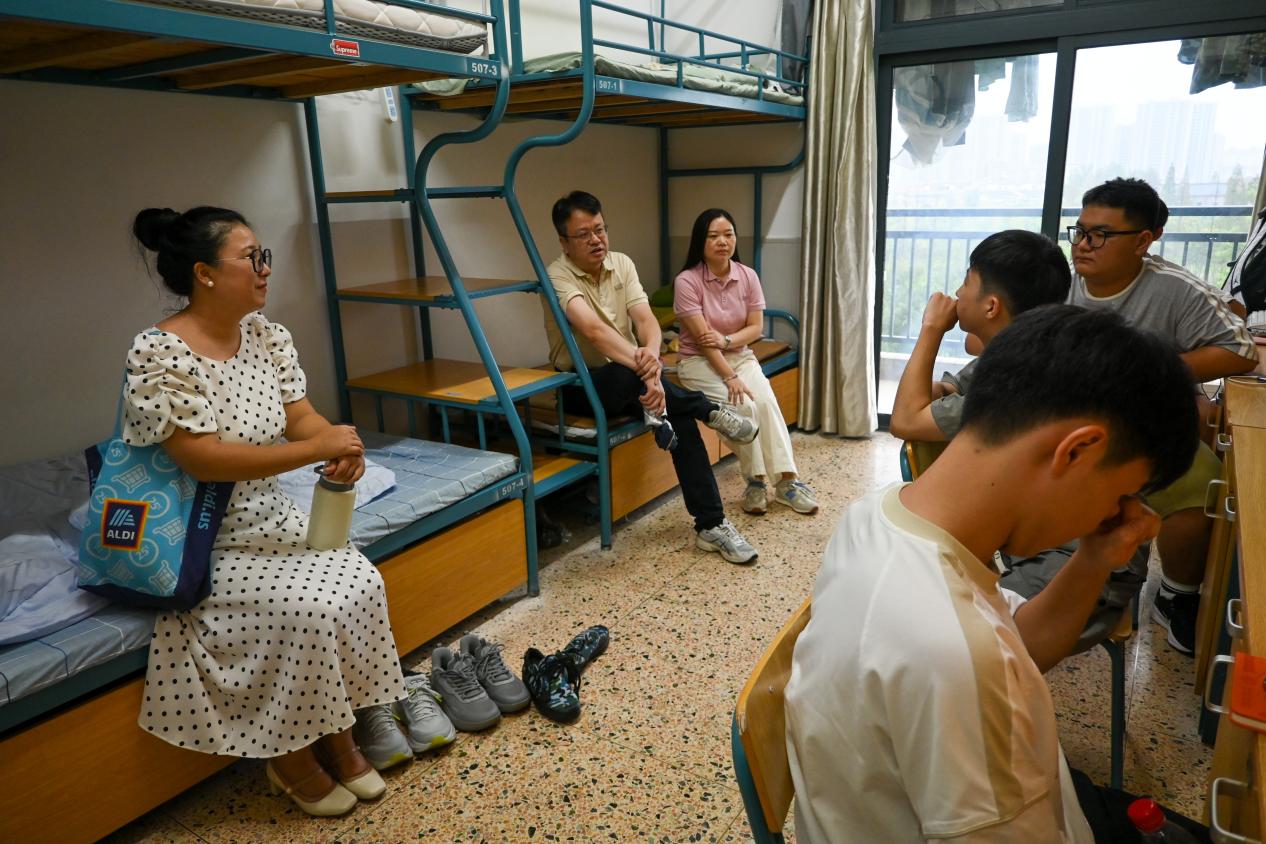 新生家长同框笑,共启大学新章红。
