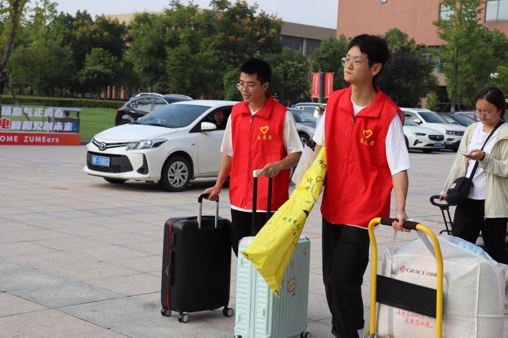 学院志愿者的身影在校园内外穿梭,帮助新生搬运行李、指引方向、讲解疑问,用细致服务彰显学院温馨氛围。