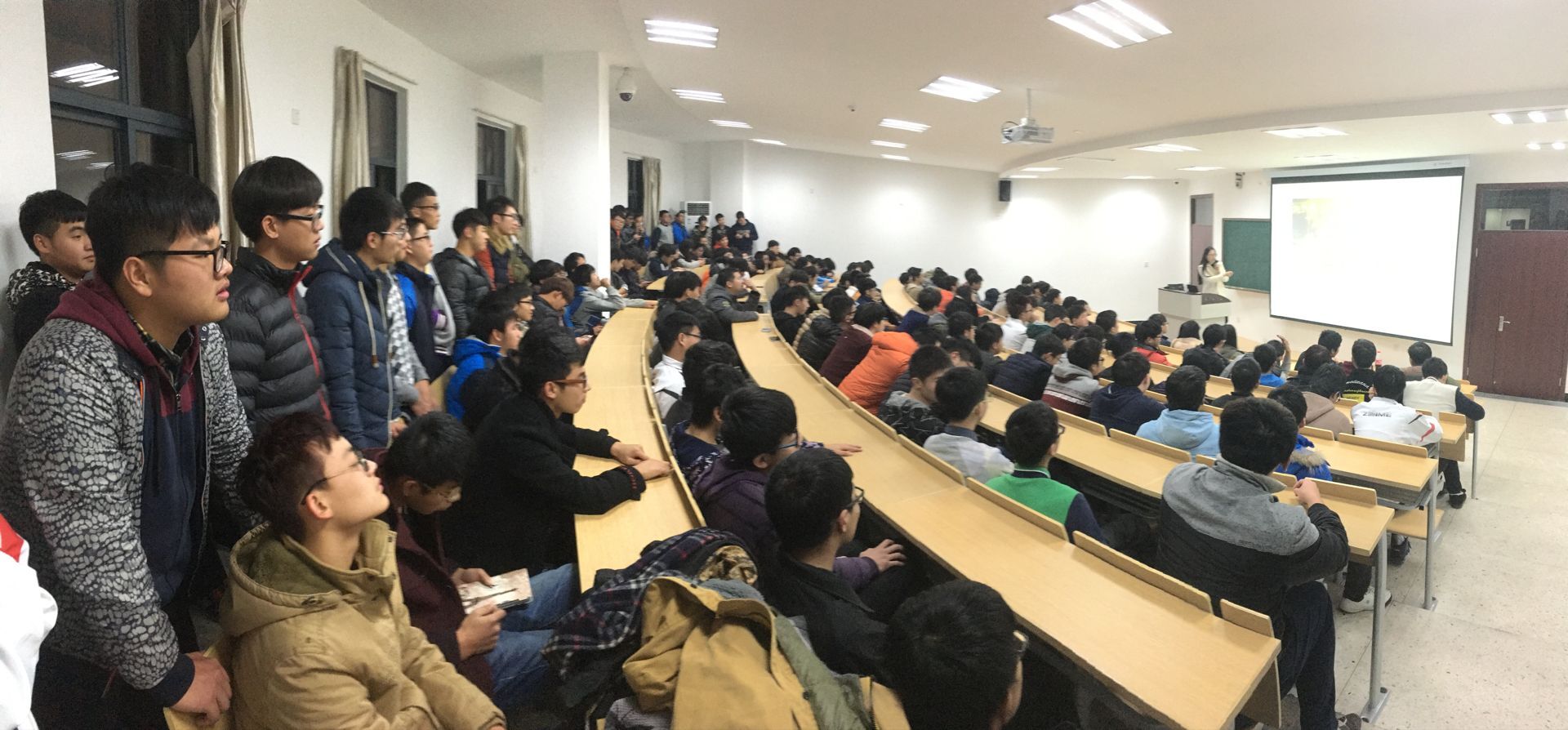 讲座18:30开始,由于同学们热情甚高,同学们提前15分钟就全部到场了,姚老师在做了简单的自我介绍后开始了讲座。首先,姚老师从一些恋爱电影入题,《少女时代》、《栀子花开》、《左耳》、《同桌的你》、《致青春》等一部部同学们耳熟能详的电影一下子调动了同学们的热情,场下讨论声不止。稍后姚老师从爱情与人生、大学生的爱情、婚姻家庭美德三个方面进行讲解。中间姚老师利用身边很多自己学生的切身例子来讲解,也不乏类似“不求天长地久,只求曾经拥有”、“说好时间的爱情”、“结婚前睁大眼睛,结婚后要闭一只眼睛”、“大学时代的恋爱,能持续到婚姻吗”……的讨论。讲座有观点的交锋,有恋爱技巧的点拨,甚至涉及到如何择偶,经营婚姻,时间持续到20:00。台上台下的互动气氛很好,还有很多同学不时发微博、微信交流自己的婚恋观点,很少有学生提早离场。最后,姚老师以恋爱简单,真爱难求,愿同学们付出真心,收获真爱,爱情路上圆圆满满结束了讲座。同学们掌声不止,站着听的同学也丝毫没有疲惫之感。