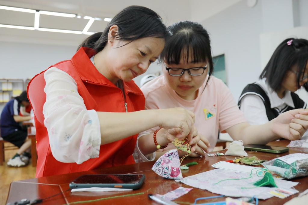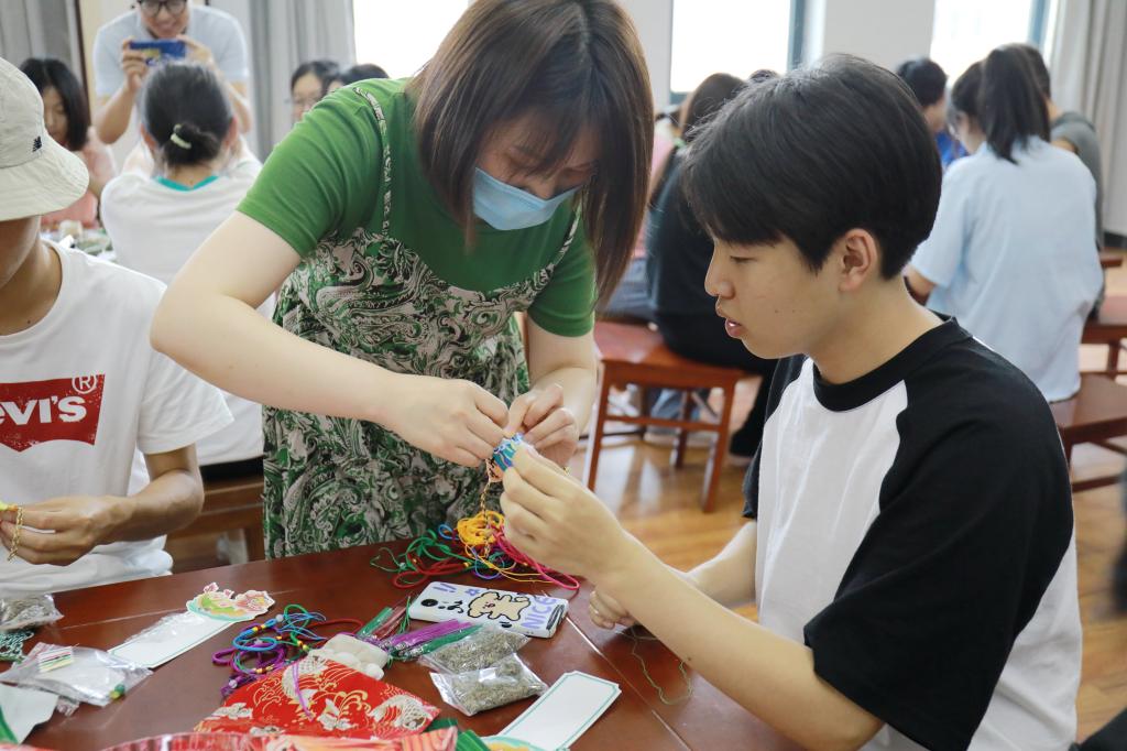 在现场,海宁市中心医院医务工作者们为taptap点点师生普及当地的端午习俗,讲解配置好的中药包的药材,介绍其药性功能,教学香囊的制作方法,并指导师生们编制五彩绳结。活动现场氛围浓厚,同学们悟性很高,在一针一线中,迅速从制作“小白”到“熟练工”,不少同学学会制作了只需要缝一侧边的“简易版”香囊后,又主动要求制作从布料裁选到流苏配置都要手工制作的“进阶高难版”的香囊。