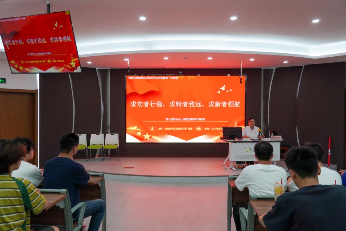 下午,自动化学院党总支书记陈罡以“求实者行稳,求精者致远,求新者领航”为主题,为毕业生党员和入党积极分子讲授“最后一课”。党课将中央八项规定精神与“求实、求精、求新”的校训精神紧密结合,围绕“反‘四风’、严守‘六大纪律’”两大核心展开,结合校园生活与未来职场场景,为毕业生党员划出行为红线。