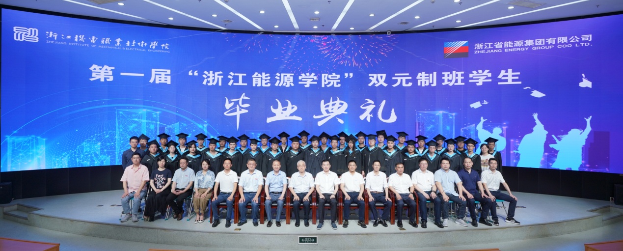在与会领导为第一届“浙江能源学院”双元制班的毕业生们颁发完毕业证、合格证和优秀学员证后,毕业典礼落下了帷幕。典礼结束后,与会领导和毕业生们一同合影留念。