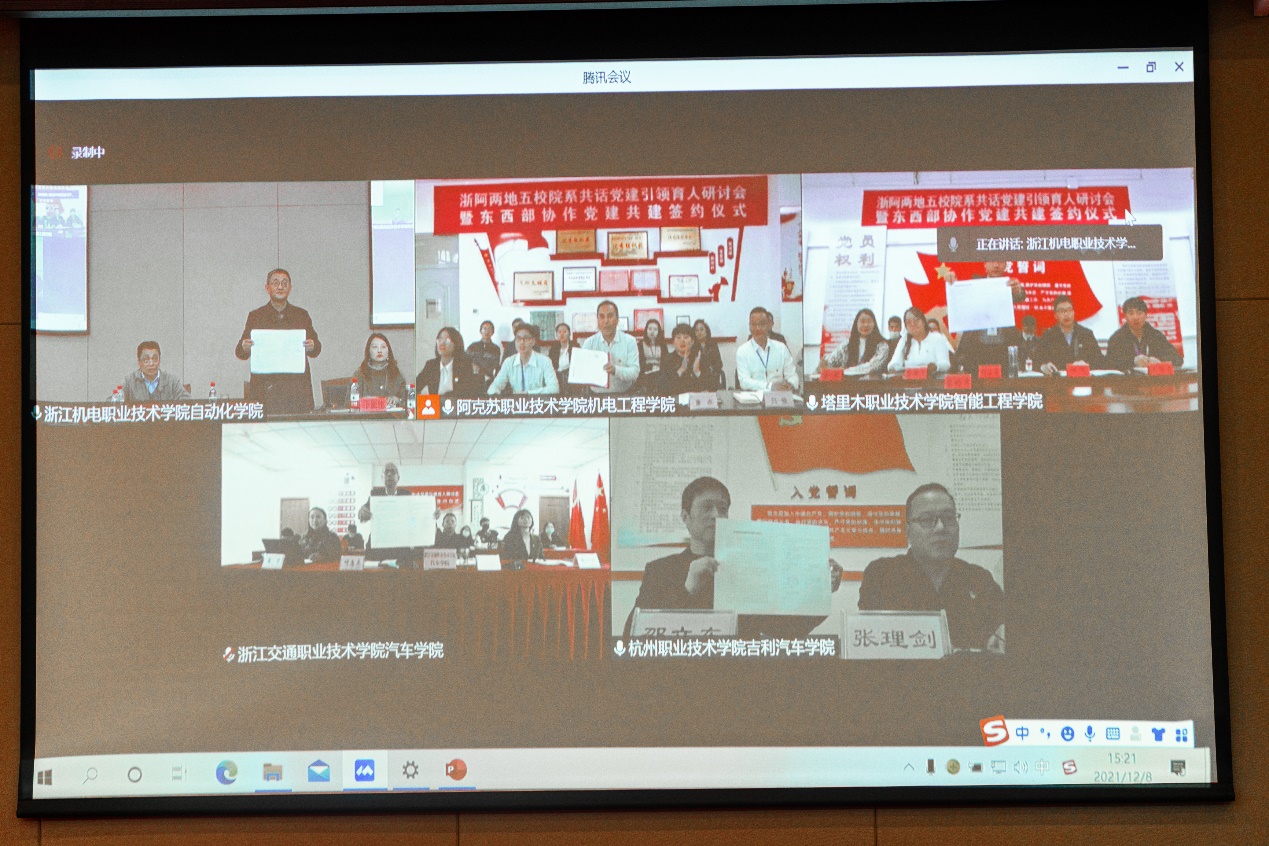 自动化学院积极响应校党委号召,积极探索“党建引领育人”新模式,深化浙阿两地职业教育领域帮扶协作,精准助力地区职业教育水平提质升级。12月8日,自动化学院牵手万里之外的阿克苏职业技术学院机电工程学院,开展“浙阿两地五校院系共话党建引领育人研讨会暨东西部协作党建共建签约仪式”,阿克苏职业技术学院机电工程学院、塔里木职业技术学院、浙江机电职业技术学院自动化学院、浙江交通职业技术学院汽车学院、杭州职业技术学院吉利汽车学院五校院系相关领导及师生代表参与结对共建启动仪式及相关活动。活动由阿克苏职业技术学院机电工程学院院长董燕主持。
