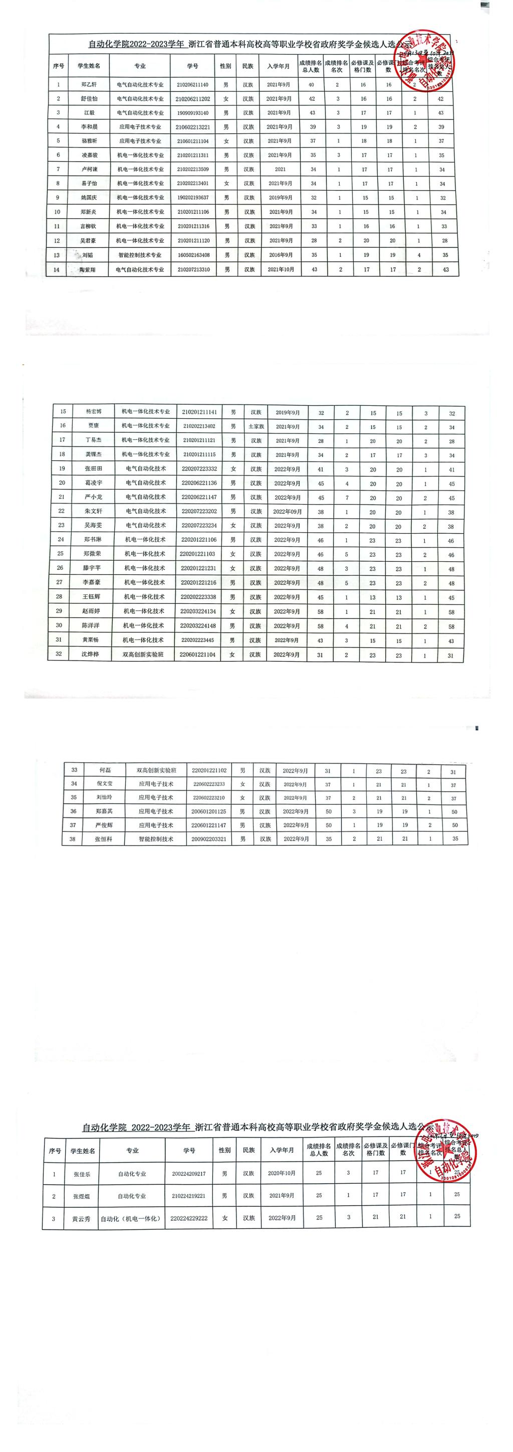 各位老师、同学,根据学校《关于开展2023年度省政府奖学金评审工作的通知》文件相关要求,经学生本人申报、班级评议、分院审核评定,现将自动化学院2022-2023学年励志奖学金候选人公示如下,公示期为2023年10月16日-10月20日。如有异议,可据实向分院反馈意见,联系人:林卡,电话:0571-87772618。