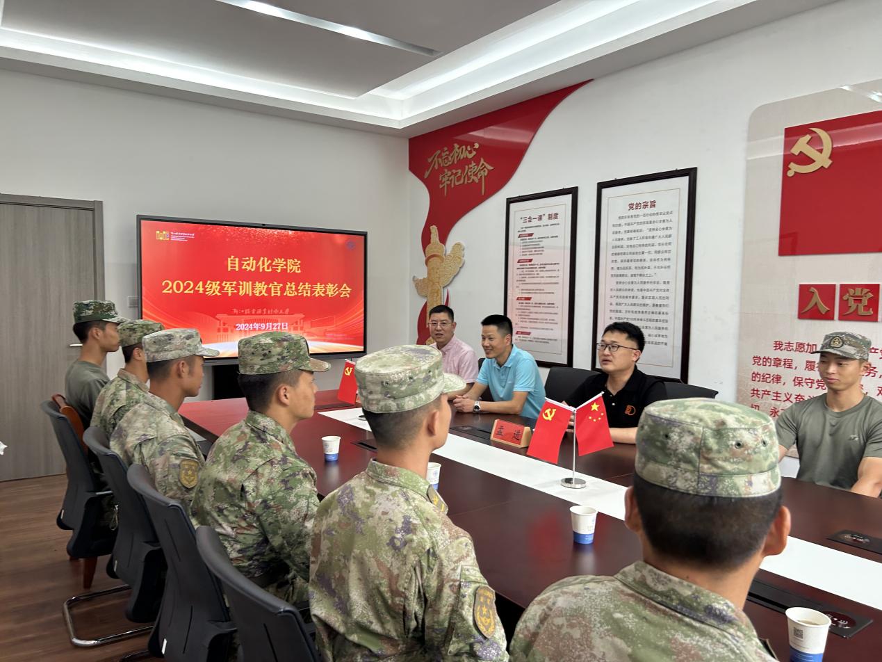 军训磨砺意志坚,团结协作谱新篇。9月27日中午,自动化学院在18-211隆重举行了2024级军训教官表彰会。学院副院长王耀军、党总支副书记罗鹏举、学工办主任孟进、全体教官及相关辅导员参加本次会议,大会由学工办主任孟进主持。