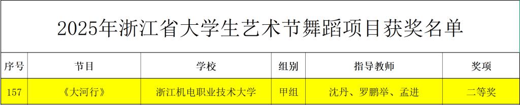 2025年12月10日,浙江省教育厅发布了2025年浙江省大学上艺术节获奖名单,我院参赛作品《大河行》以恢弘的气势展现劳动人民与大河抗争的慷慨激昂,在本次比赛中荣获二等奖。
