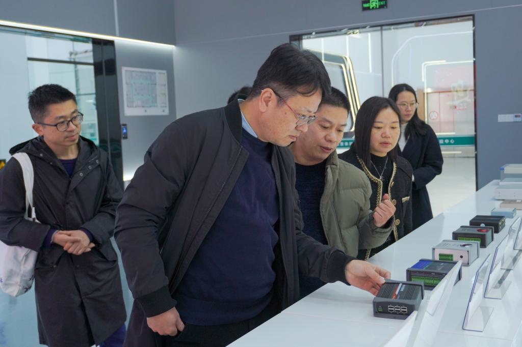 在俞敏波校友的陪同下,学院一行参观了公司办公环境、研发中心及实验场地。走访过程中,俞敏波详细介绍了企业自2016年创立以来的发展历程、核心技术与产品布局、主营业务开展情况以及所获得的一系列荣誉与资质。作为一家专注于电力智能检测与智慧实验室建设的国家级高新技术企业,应敏科技已逐步成长为年营收过亿、细分市场占有率领先的行业佼佼者,其自主研发的电力电缆系列试验设备、国内首台电缆直流电阻快速测量试验机等产品,有效解决了行业痛点,提升了检测效率与智能化水平。