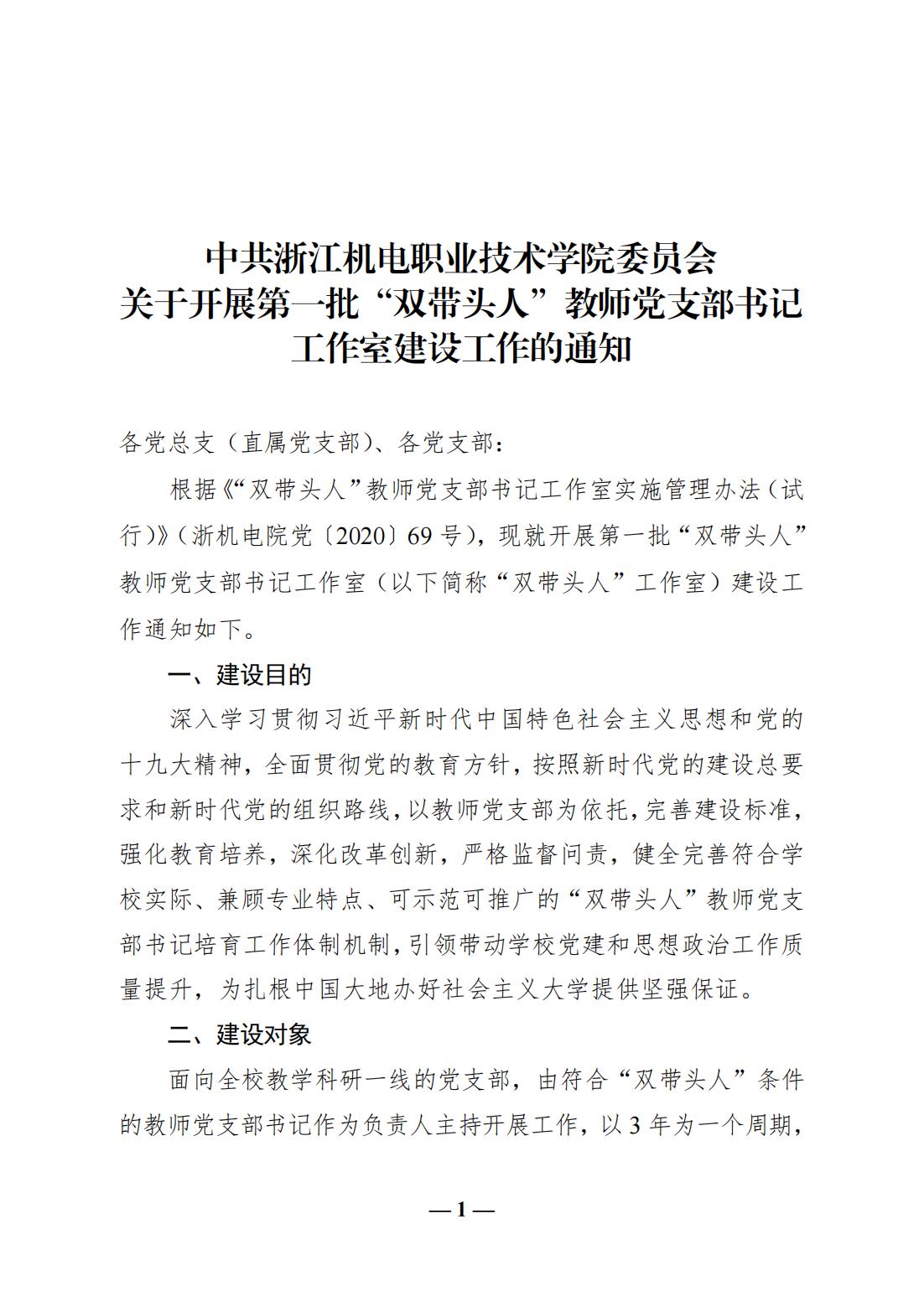 中共浙江机电职业技术学院委员会 关于开展第一批“双带头人”教师党支部书记 工作室建设工作的通知