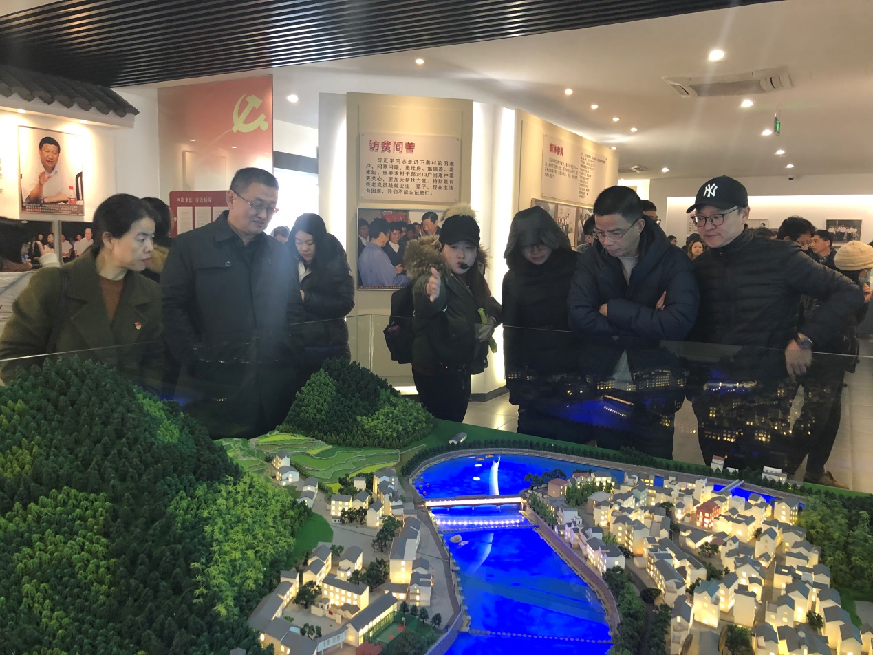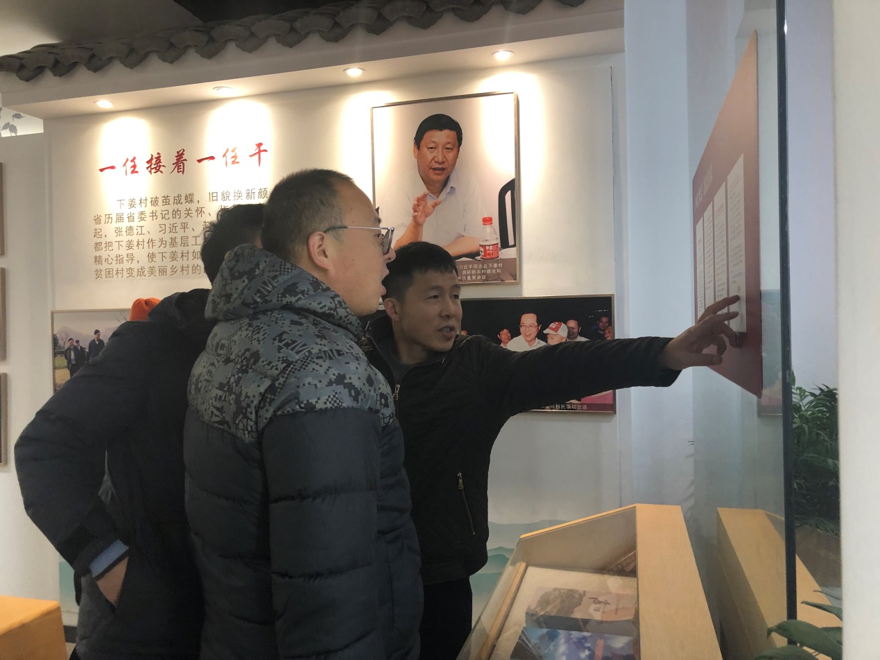 “下姜村,梦开始的地方”。下姜村曾是习近平、张德江在浙江担任省委书记时的基层联系点,继任省委书记赵洪祝、夏宝龙、车俊等也都把下姜村作为自己的基层联系点,多次到村里蹲点调研,指导村“两委”发展经济,建设美丽家园。党员们在讲解员的带领下参观了文化礼堂、村史展览馆,考察了下姜村的村容村貌。展厅内的一张张照片,一个个感人的故事记录着下姜村旧貌换新颜的历史蜕变。在参观之后,同志们切身感受到了下姜村巨大的发展变化和浓厚的红色文化氛围。大家感慨万千,从一个“土墙房,半年粮,烧木炭,有女不嫁下姜郎”的远近闻名的贫困村发展成为一个生动演绎和实践“绿水青山就是金山银山”的明珠村,下姜村为乡村振兴树起了新时代的标杆。
