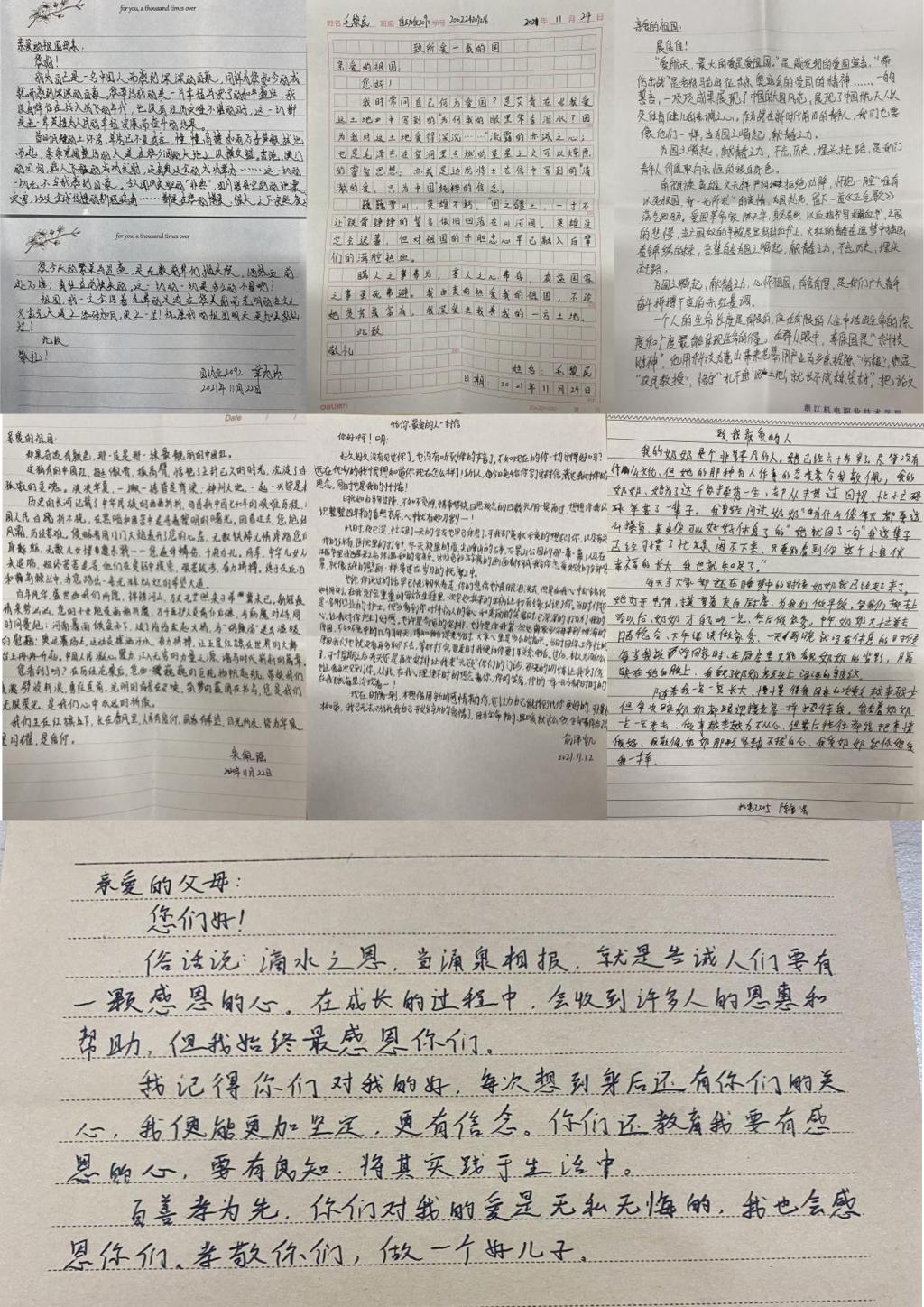 “从前的日子变得慢,车,马,邮件都慢……”而在这个网络遍布、即时可通讯的时代里,有多久,你没有提起手中的笔,给爱你的或你爱的人,写一封书信了?为此自动化学院学院举办了家风主题活动——《写一份信给你爱的人》。以纸笔为媒,以书信为介,同学们参与的《写一份信给你爱的人》这个活动不只局限于传统意义上的家信,这其中既有同学们对祖国母亲的崇高致敬,也有对家人的真情流露;既有普通家庭父母、儿女之间的心灵碰撞,也有同学们对其启蒙老师的感恩之情。每一位同学,都在用心书写着一封封属于自己的家书故事。