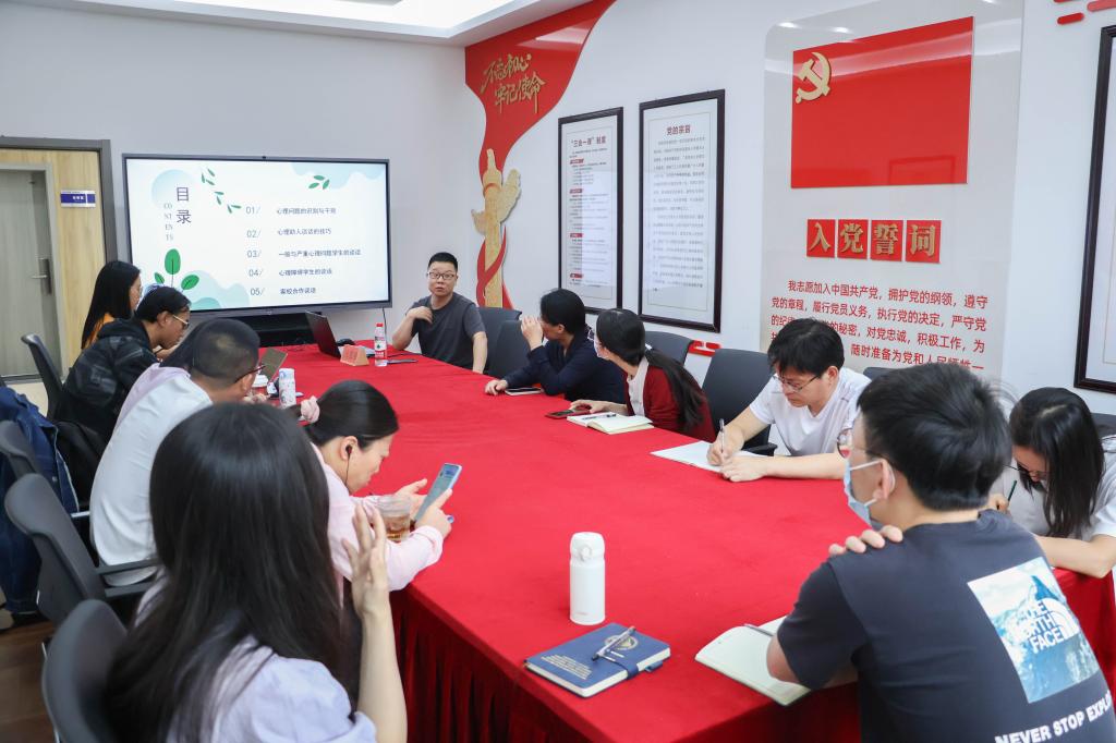 培训会上,张宝强老师以其丰富的专业知识和实践经验,围绕“心理问题的识别与心理危机应对”主题,就学生常见心理问题及有效的心理教育策略与在座的班主任们进行了深入的交流和探讨。首先,张老师详细讲解了大学生心理障碍识别和心理疾病区分标准,以及如何通过观察学生的日常表现来准确判断其心理状态。其次,张老师从班主任的角色定位出发,与大家探讨了如何应对心理问题,通过学会与学生谈话走进学生内心,同时对于需要关注的学生,持有保密、及时转介等基本原则,尝试与学生建立可靠可信的联结,给予恰当的帮助与支持。最后,张老师结合自己的工作经验,分享了一些家校沟通的方法和技巧,让参训班主任受益匪浅。