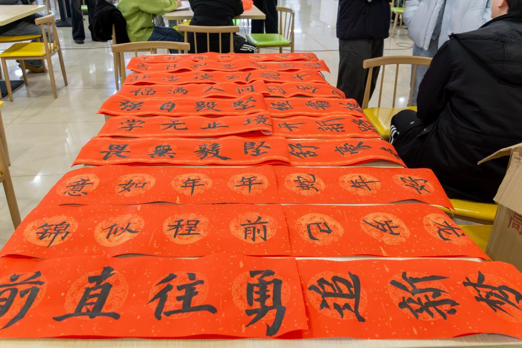一边,书法爱好者们正挥洒自如,笔走龙蛇,用墨香传递着新春的祝福。一幅幅春联如诗如画,不仅展现了中国书法的韵味,更让在场的师生沉浸在浓厚的节日气氛和深厚的文化传承之中。