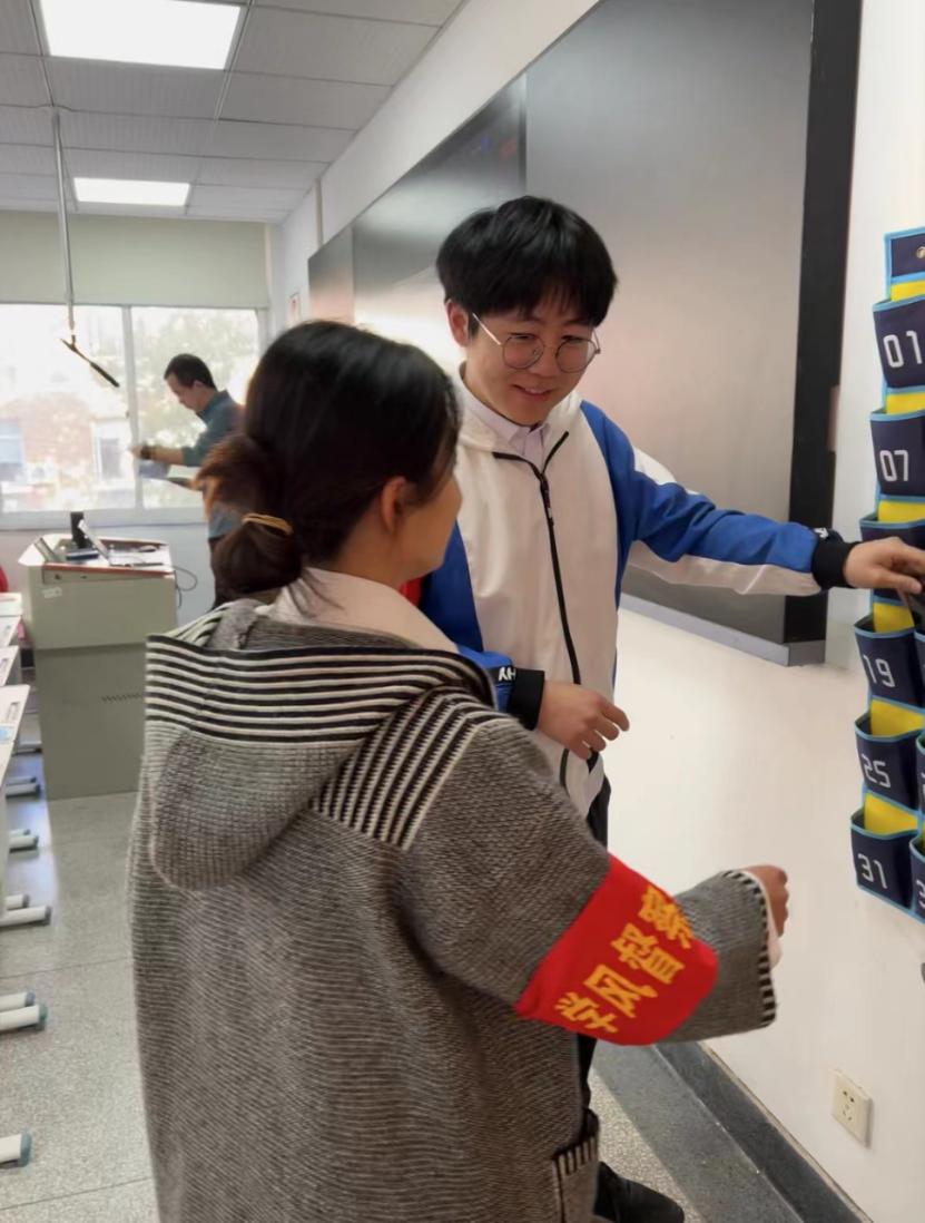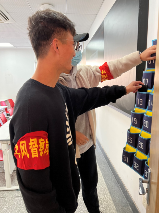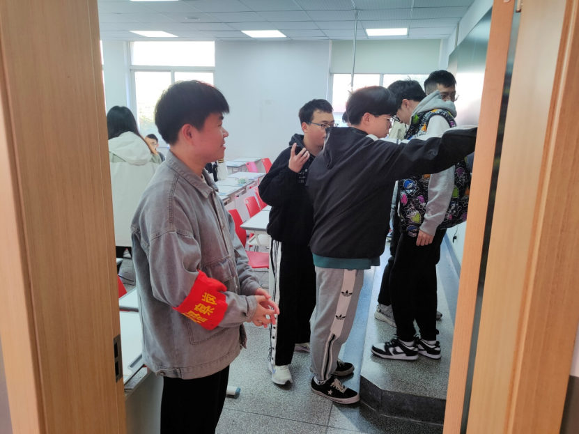 自动化学院志愿者们在教学楼下站岗执勤,他们身体力行,坚持早起,像挺拔的松树一般站在门口提醒同学们不迟到不早退,正确佩戴口罩,不带三餐进教学楼。在巡查过程中,志愿者们提醒同学们手机入袋,保持良好的精神状态迎接每一节课,这不仅维护了教学楼学习环境的干净整洁,营造了和谐有序的教学环境,更进一步推动了文明校园的创建。