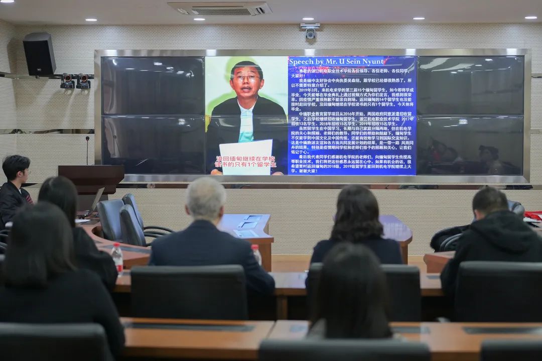 Then, Mr. U Sein Nyunt, a member of the Central Executive Committee of the Myanmar-China Friendship Association, expressed his gratitude through a video message. He thanked Zhejiang Institute of Mechanical and Electrical Engineering (ZIME) for the care and high-quality vocational and technical education provided to the Burmese students. He also expressed his hope that the Burmese international students from the 2018 and 2019 cohorts would have the opportunity to return to ZIME for further studies.