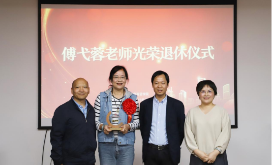 后举行了傅弋蓉老师光荣休仪式,程勤华书记发表了热情洋溢的讲话,充分肯定了傅弋蓉老师为学校教育事业作出的贡献,并希望傅老师退休不退志、离岗不离心,在合理安排好自己退休生活的同时,能够常回来看看,一如既往地关心、关注和支持学院建设发展。毕业生代表程超杰通短视频深情回忆了在校期间傅弋蓉老师对他的关心和教育,也为傅老师送上了良好的退休祝福。最后全体老师齐唱《生日歌》,祝愿傅老师生日快乐,退休快乐