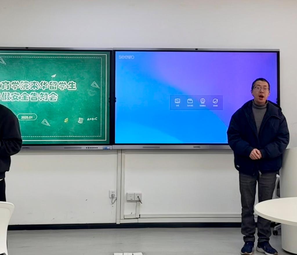 许简针对留学生寒假管理方案中的重要事项向同学们进行了解释说明,向每位同学发放了留学生寒假安全告知书并签署。他希望同学们能够严格遵守学校和学院的规章制度,度过一个平安、充实、快乐的假期。