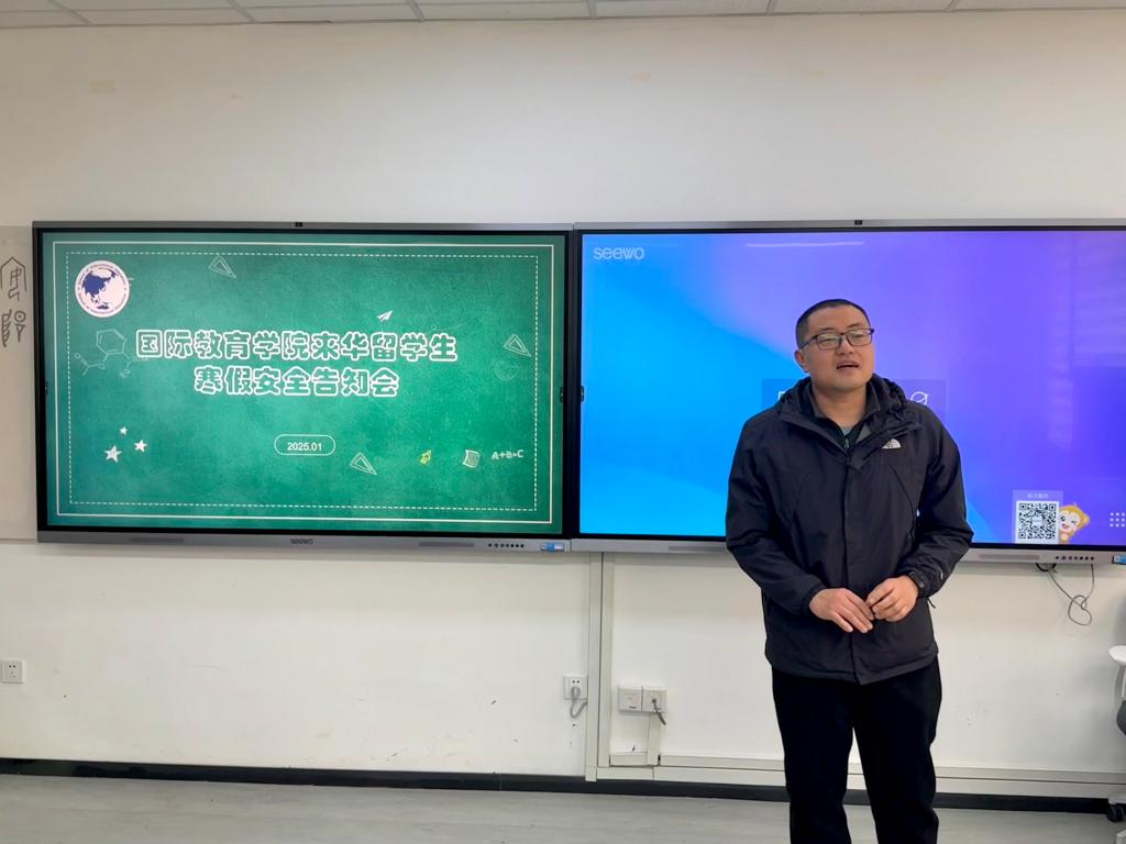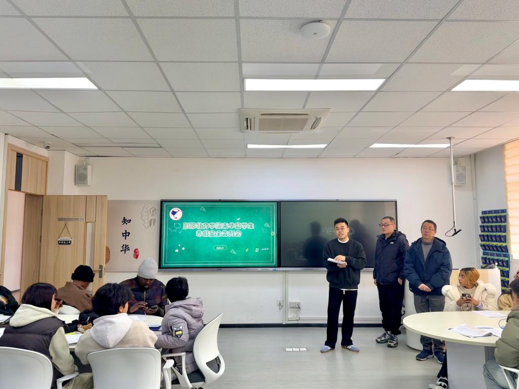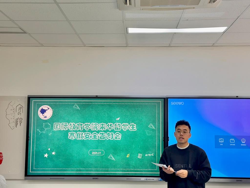 1月14日,国际教育学院学工办联合外事办召开了来华留学生寒假安全告知会议。学工办主任黄熠、外事科科长孙岩松、留学生辅导员许简出席会议,全体留学生参会。