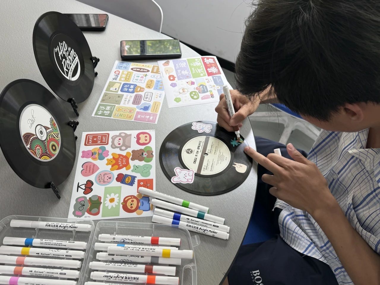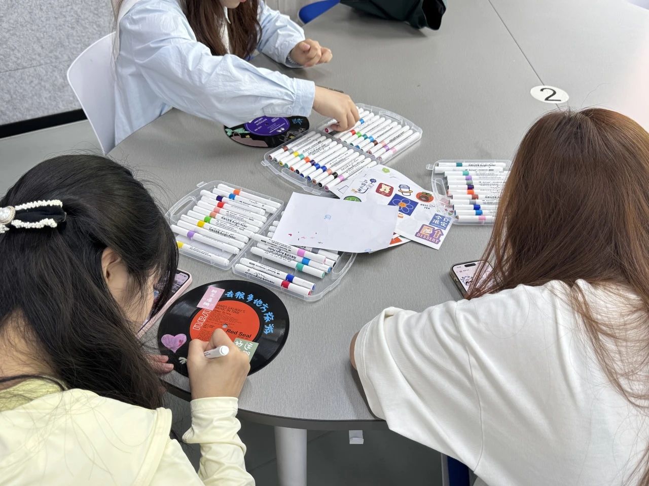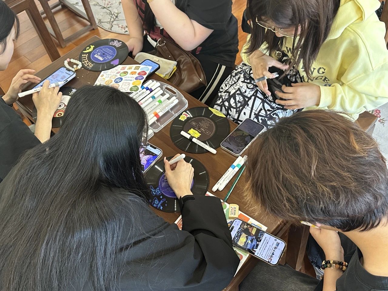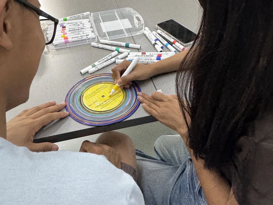 手工DIY制作的意义在于用自己的双手体验创造的乐趣,同学们可以根据自己的兴趣和想法自由地选择材料和工具,进行创作。同学们拿着空白的黑胶唱片,发挥自己的想象力和动手能力,将心中所想所思展现出来,慢慢地绘制出一个个创意满满、色彩缤纷的作品。大家以涂绘的方式表达对生活的热爱,承载着大家对未来的期许和愿望,记录自己深藏的心声。