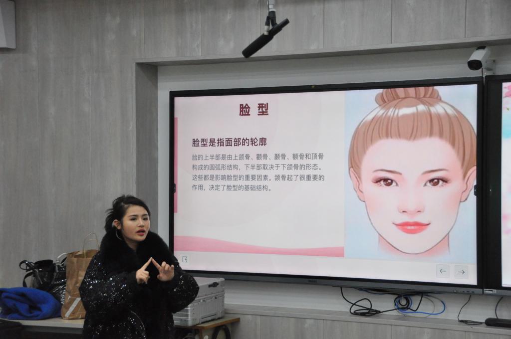 化妆师首先介绍了化妆的基本知识,包括底妆打造、眉形设计、眼影挑选、色彩搭配等,化妆是一门有专业技巧和方法的艺术。详细的理论知识介绍让同学们对化妆有了基本的认识。
