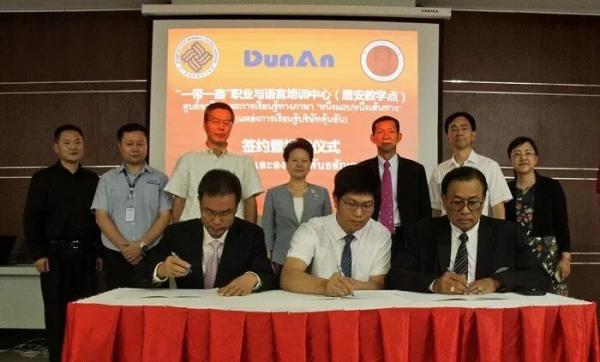 10月17日上午,由盾安金属(泰国)有限公司、浙江机电职业技术学院与泰国东部职业教育集团合作共建的“一带一路”语言与职业教育培训中心(盾安教学点)在泰国罗勇工业园盾安金属泰国有限公司顺利签约并揭牌。三方共同签署了合作备忘录,而后我院与泰国东部职业教育集团签署了第一期对外汉语教学协议。浙江省对外经济贸易促进委员会会长吴桂英、浙江省人大常委会副秘书长张国强、浙江省外侨办副主任顾建新、盾安金属泰国有限公司总经理蒋广学、浙江机电职业技术学院院长丁金昌、泰国东部职业教育集团副总裁Narong、泰国罗勇技术学院院长Chucheep、浙江机电职业技术学院国际交流中心主任陶宇、浙江经贸职业技术学院国际交流中心主任顾鸣镝、盾安金属泰国有限公司副总经理潘保国等嘉宾出席了此次签约暨揭牌仪式。