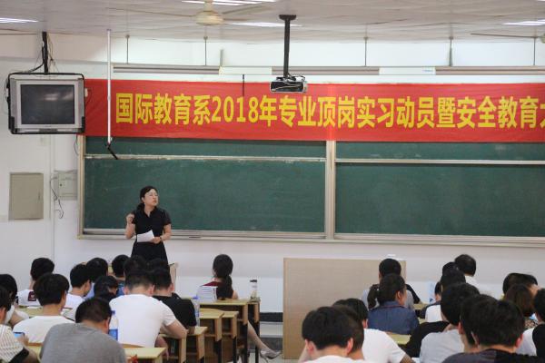 2018年5月16日,国际教育系顺利召开2018年专业顶岗实习动员暨安全教育大会。参加会议的有国际教育系陶宇主任、直属党支部周琳书记、学院教务处产学办周平老师、学院保卫处冯团友老师以及全体指导教师和国际教育系2016级全体学生。会议由系办、学工办主任史奕主持。