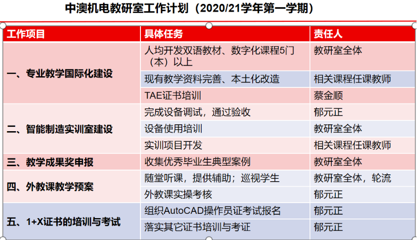 会上,国际教育学院院长陶宇对于上学期及暑期重点工作进行回顾总结,同时结合学校“双高”建设、争创职教本科试点的总体要求,对新学期教学工作做了总体安排和部署,重点细化“双高”建设的子任务,要求任务到人、责任到人。要求从“机构、标准、课程、资源、教材”全面推进国际教育学院“双高”建设子任务:(一)分院层面:承办国际会议、引领协会、开拓新的中外合作模式、拓展“一带一路”服务平台、设置国际交流奖学金;(二)专业教研室层面:全力推进专业标准、课程标准、教学资源、“本土化”教材建设;(三)内部治理和信息化建设,要求任务建设形成闭环(标准、课程、资源、教材),任务实施挂图作战(计划-实施-检查-反馈上墙),做好“最多跑一次”响应推进,为学校“双高”建设助力。